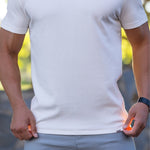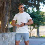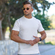 The Men's Deluxe Stretch Knit T-Shirt in White has a physique flattering athletic fit, with a deluxe Rayon stretch fabric for ultimate comfort in a modern style
