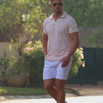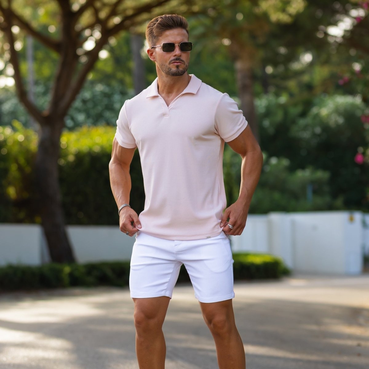 The Men's Open Collar Rayon Knit Polo in Blush Pink has a physique flattering athletic fit, with a deluxe Rayon stretch fabric for ultimate comfort in a modern style featuring a buttonless open collar