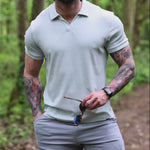 The Men's Open Collar Rayon Knit Polo in Linen Blue has a physique flattering athletic fit, with a deluxe Rayon stretch fabric for ultimate comfort in a modern style featuring a buttonless open collar
