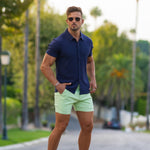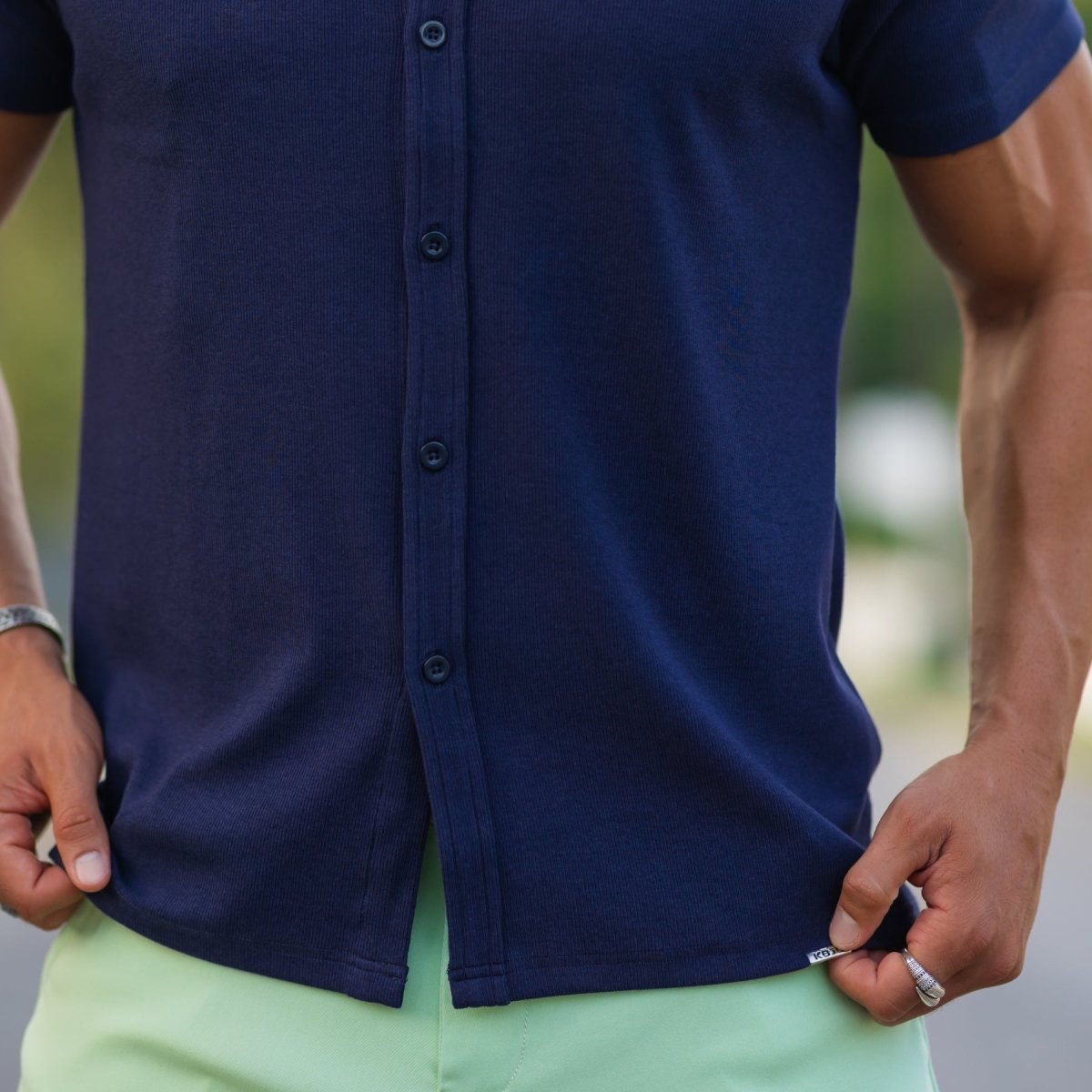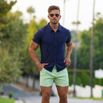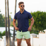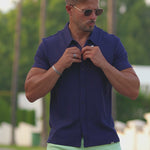 The Men's Knit Rayon Short Sleeve Shirt in Navy Blue has a physique flattering athletic fit, with a deluxe Rayon stretch fabric for ultimate comfort in a modern style featuring a classic button up look.