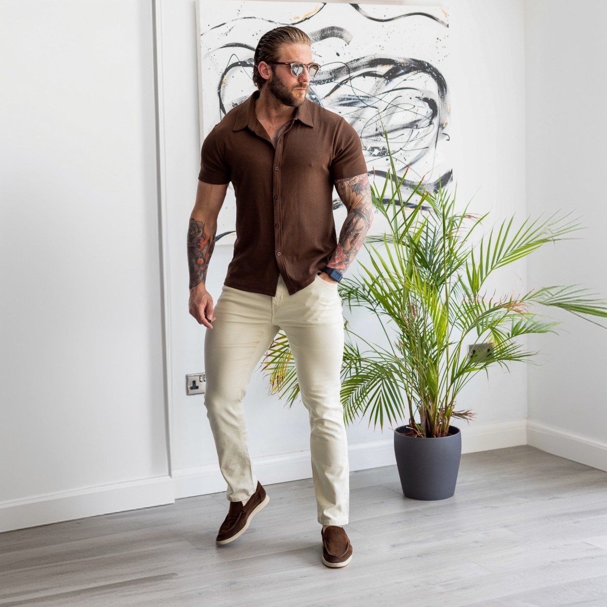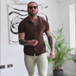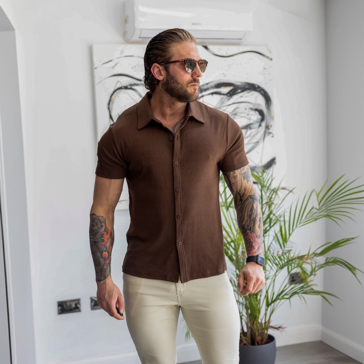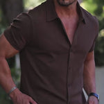 The Men's Knit Rayon Short Sleeve Shirt in Walnut has a physique flattering athletic fit, with a deluxe Rayon stretch fabric for ultimate comfort in a modern style featuring a classic button up look.